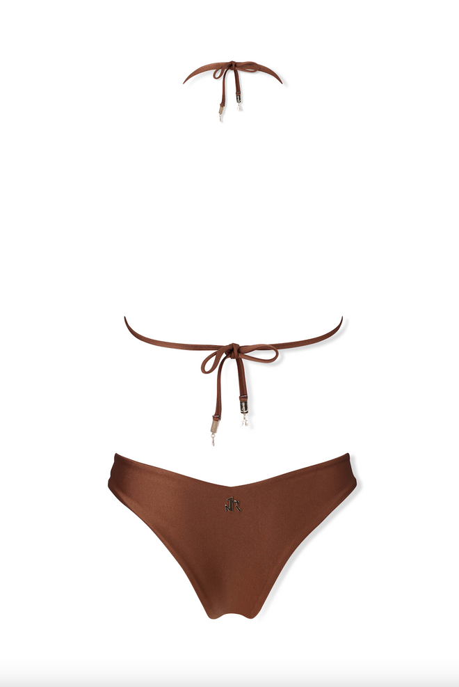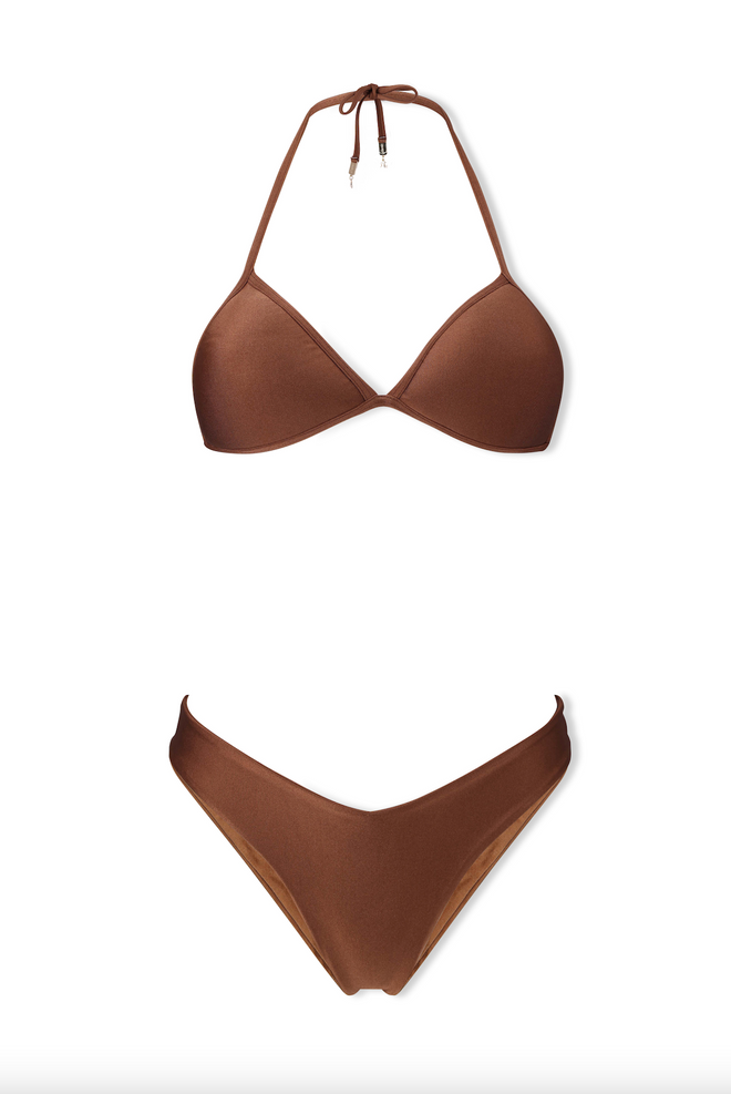 A classic triangle bikini top with a clean neckline and thin ties at the back and neck. Features light padding for subtle support and a natural, feminine shape. Its sleek lines and minimalist cut offer timeless elegance.