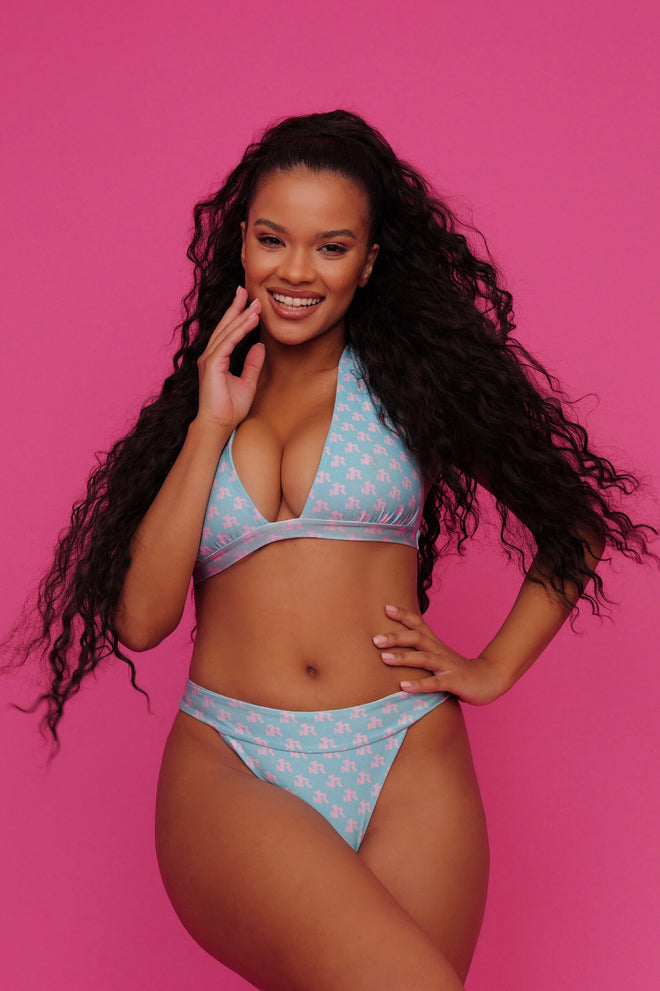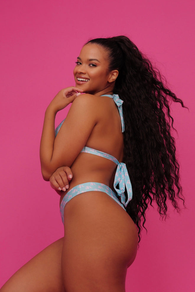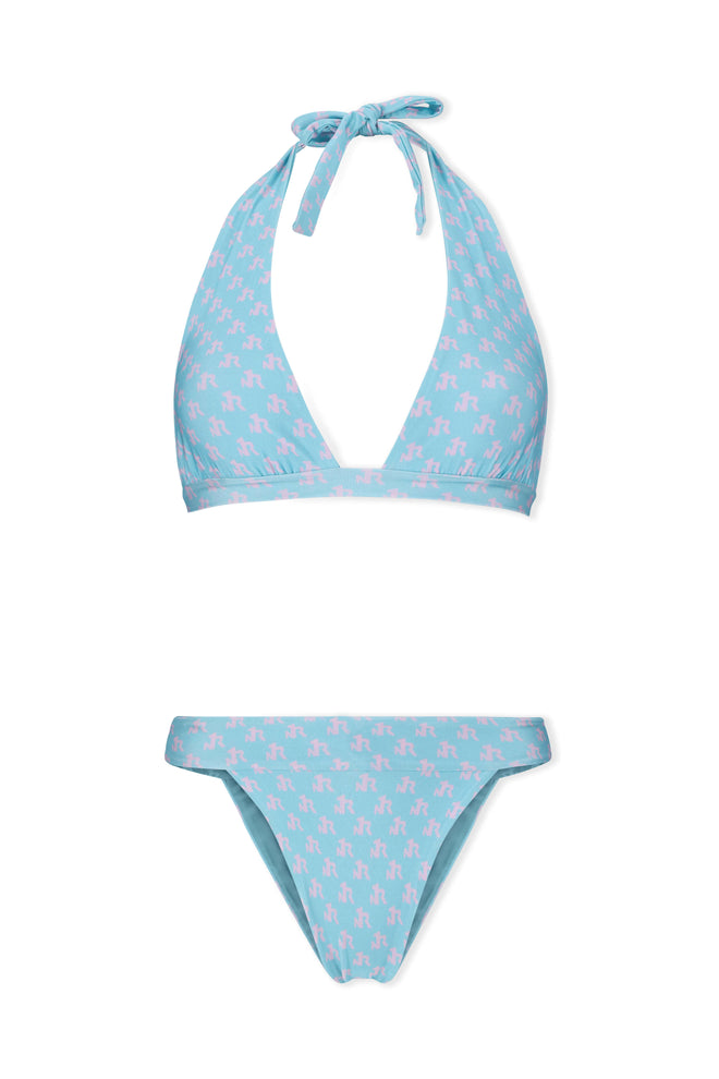 A deep halter-neck bikini top with wide back ties, designed for an elegant and defined look. It offers great support and a bold presence.