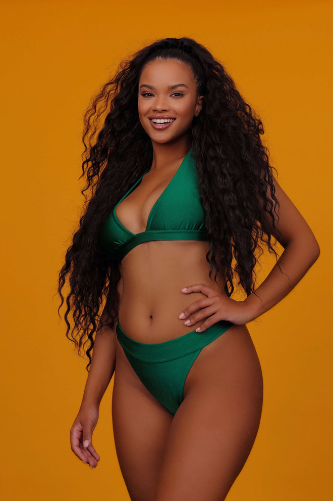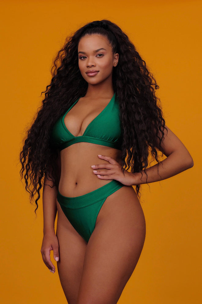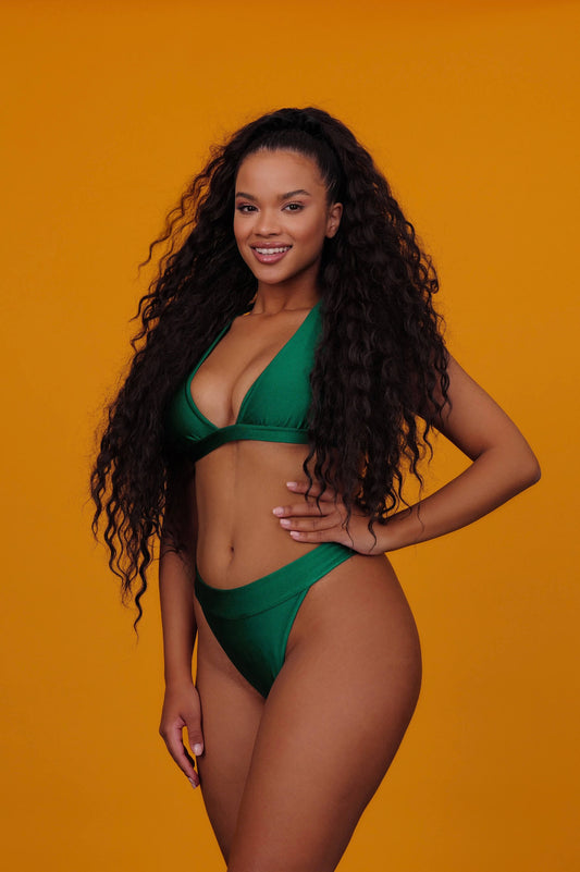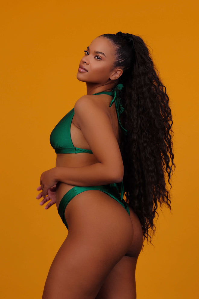 A deep halter-neck bikini top with wide back ties, designed for an elegant and defined look. It offers great support and a bold presence.