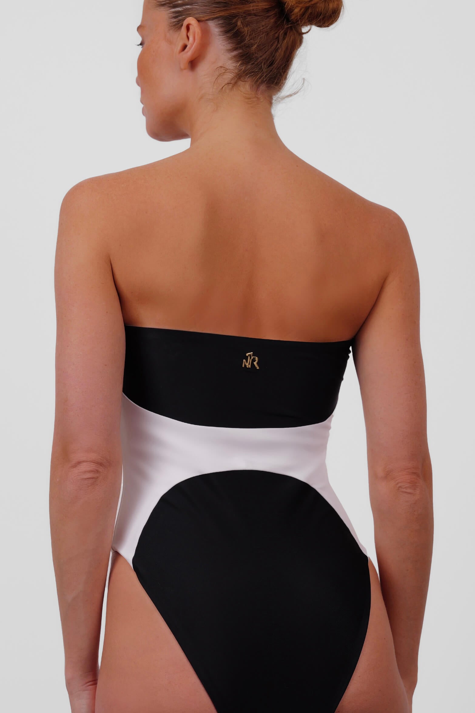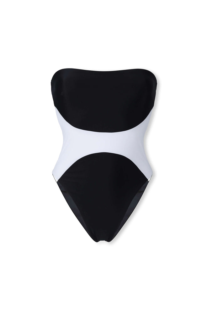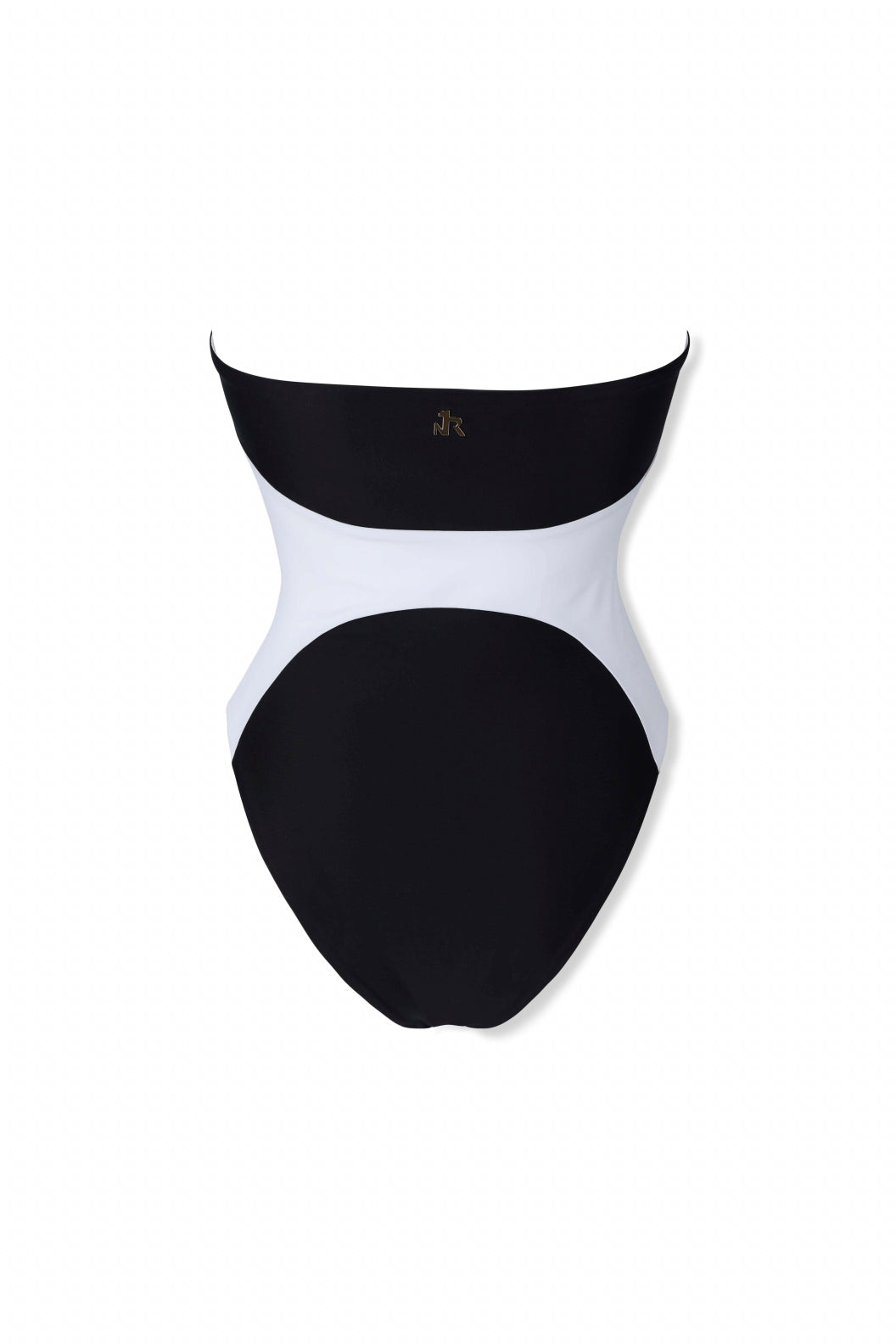 - Silhouette Type: Strapless one-piece with contrast paneling that defines the waist.