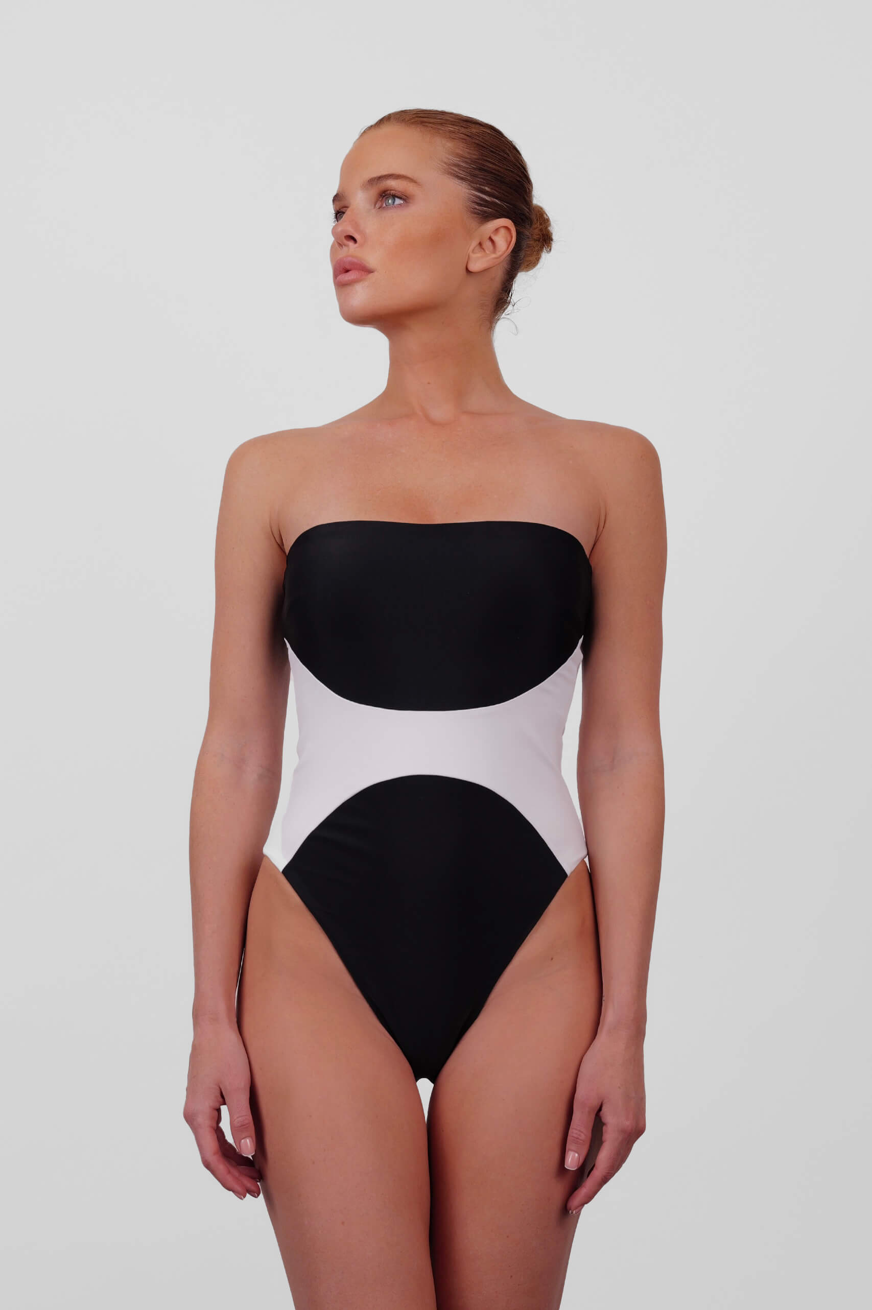 - Ideal for: Women seeking a structured, flattering strapless swimsuit with bold lines and minimalist elegance.