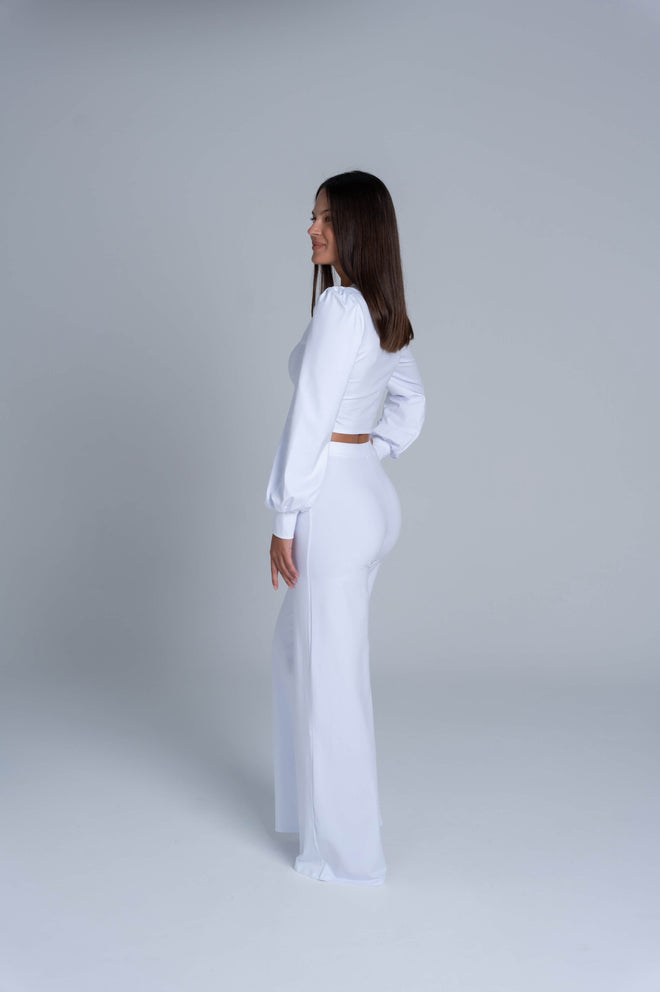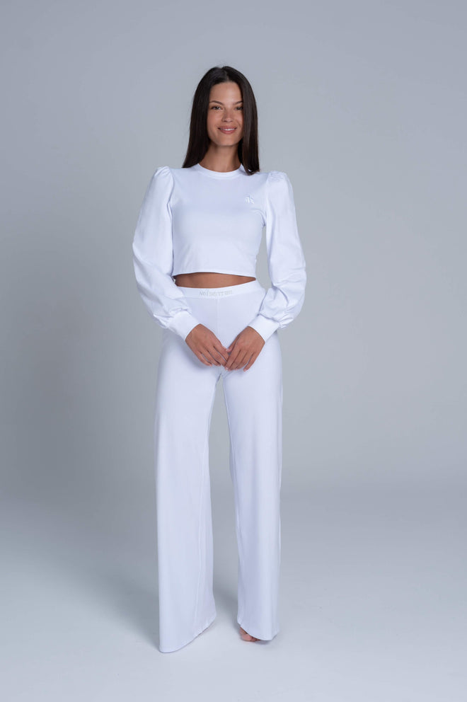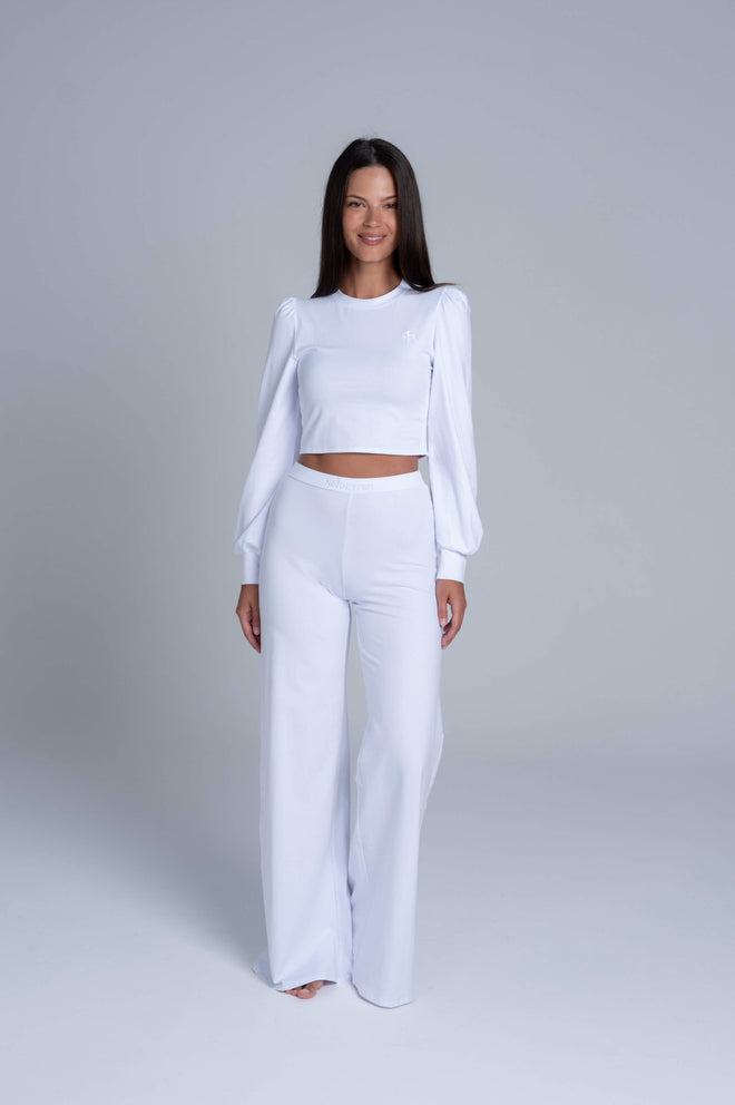 The Chill Chick Set blends effortless comfort with sleek style. Featuring a cropped long-sleeve top with puffed sleeves and wide-leg high-waist pants, this look is both relaxed and fashion-forward. Made from soft, breathable fabric, it’s designed for ultimate versatility, perfect for lounging in style or stepping out with confidence.