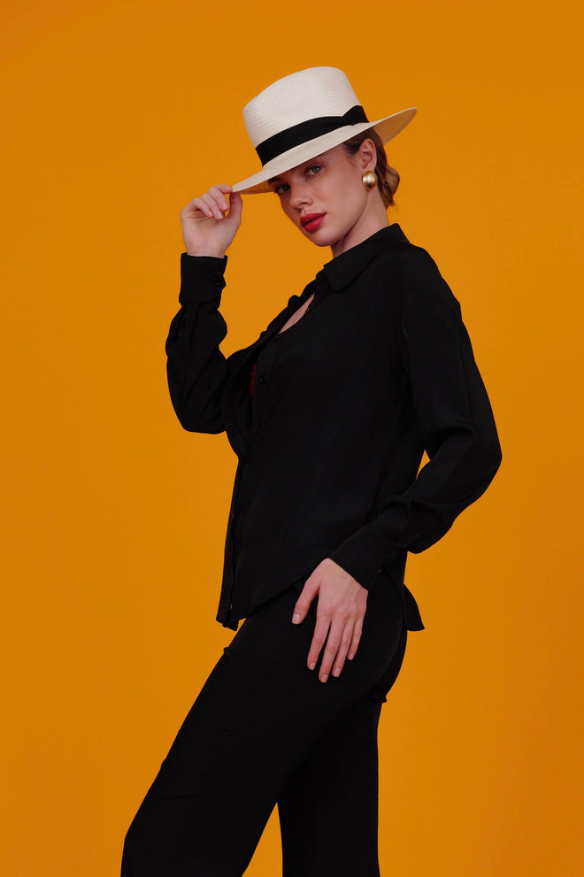 This refined two-piece set is crafted from lightweight, semi-sheer 100% polyester fabric with a subtle sheen, offering a fluid drape and breathable comfort. The long-sleeve shirt features a relaxed, oversized fit with a classic collar, buttoned cuffs, and a soft, flowing silhouette that can be worn open or styled as a light outer layer. The high-waisted pants are designed with a flattering wide-leg cut, an elastic waistband for a comfortable fit, and a smooth finish that elongates the body. Perfect for effortless elegance, this set blends sophistication with ease, ideal for warm evenings or elevated daytime dressing.