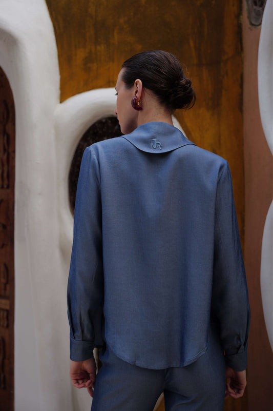 This refined two-piece set is crafted from lightweight, semi-sheer 100% polyester fabric with a subtle sheen, offering a fluid drape and breathable comfort. The long-sleeve shirt features a relaxed, oversized fit with a classic collar, buttoned cuffs, and a soft, flowing silhouette that can be worn open or styled as a light outer layer. The high-waisted pants are designed with a flattering wide-leg cut, an elastic waistband for a comfortable fit, and a smooth finish that elongates the body. Perfect for effortless elegance, this set blends sophistication with ease, ideal for warm evenings or elevated daytime dressing.