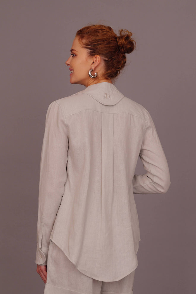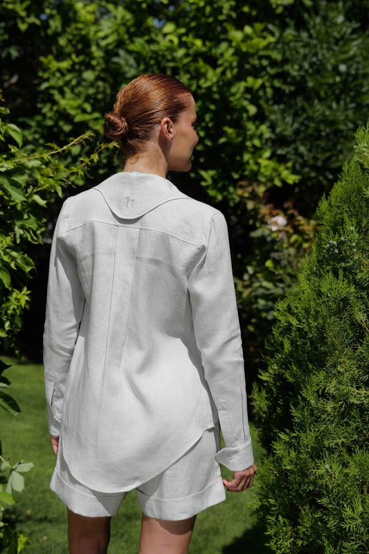 Expertly tailored from 100% natural linen, these high waisted shorts combine structured elegance with breathable comfort. Designed to flatter the silhouette, they feature soft front pleats, discreet side pockets, and a clean back for a smooth finish. The wide waistband offers a defined fit and is adorned with a finely embroidered logo, adding a signature touch of sophistication. With their natural texture and airy feel, these shorts are the perfect balance of polished and effortless ideal for warm days and elevated resort styling.