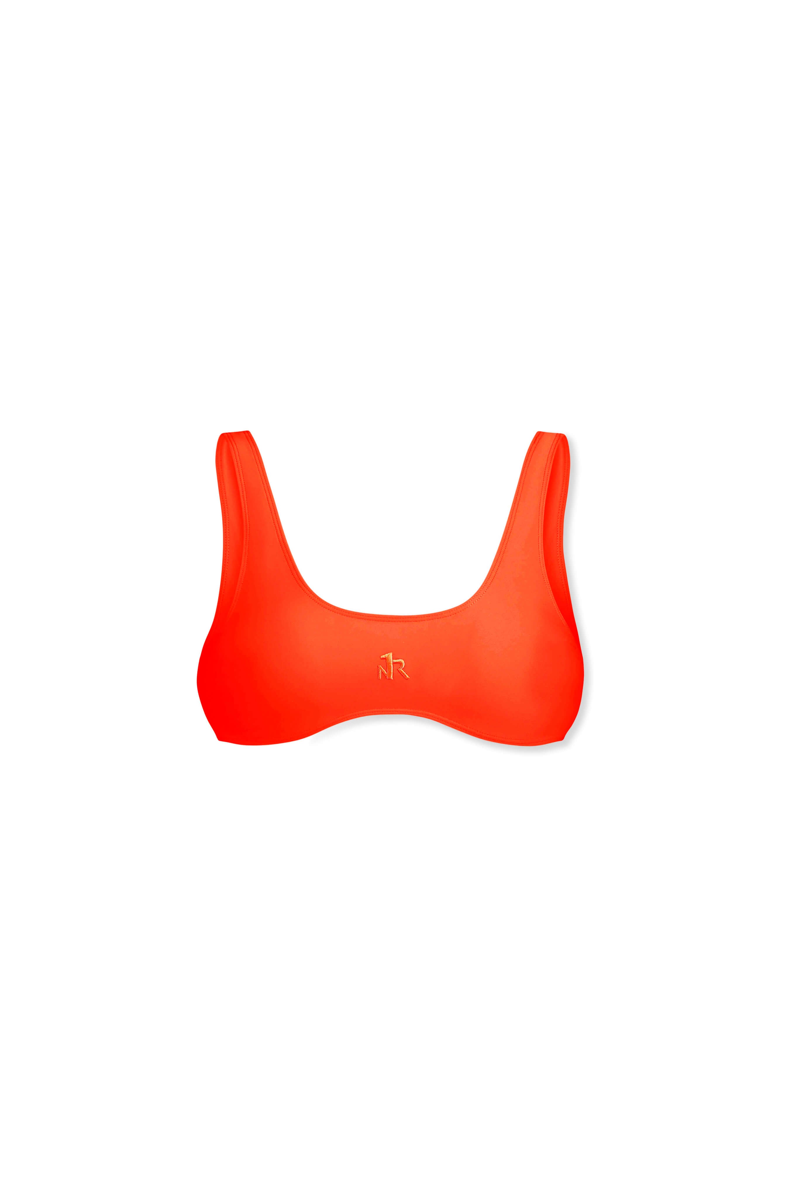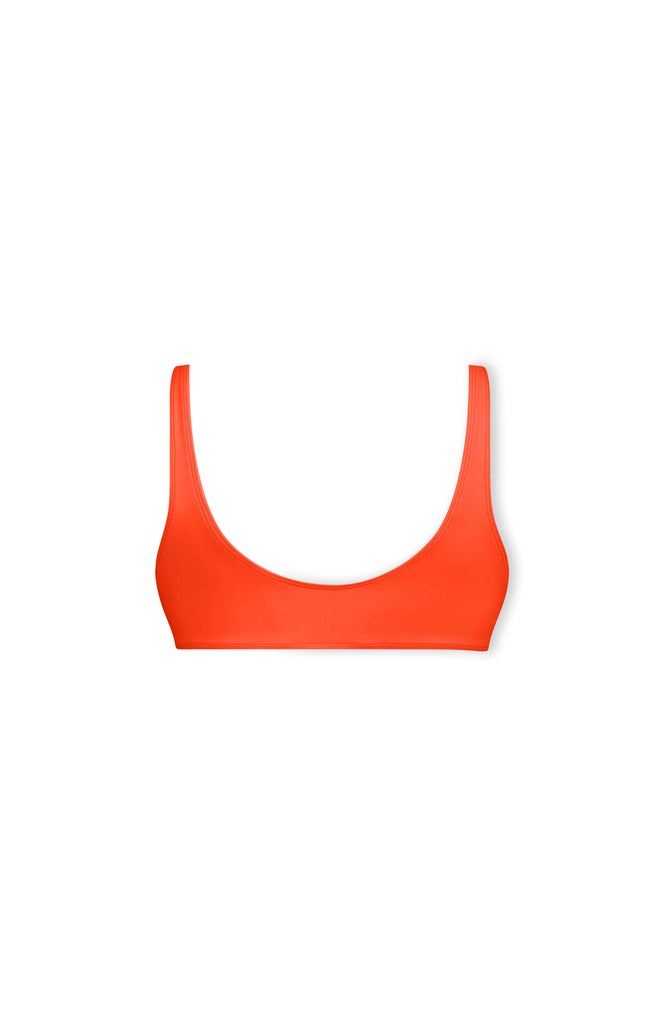 A sporty, tank-style bikini top with wide straps that extend straight from the front into a low, open back. Designed for full shoulder support with a sleek, modern aesthetic.