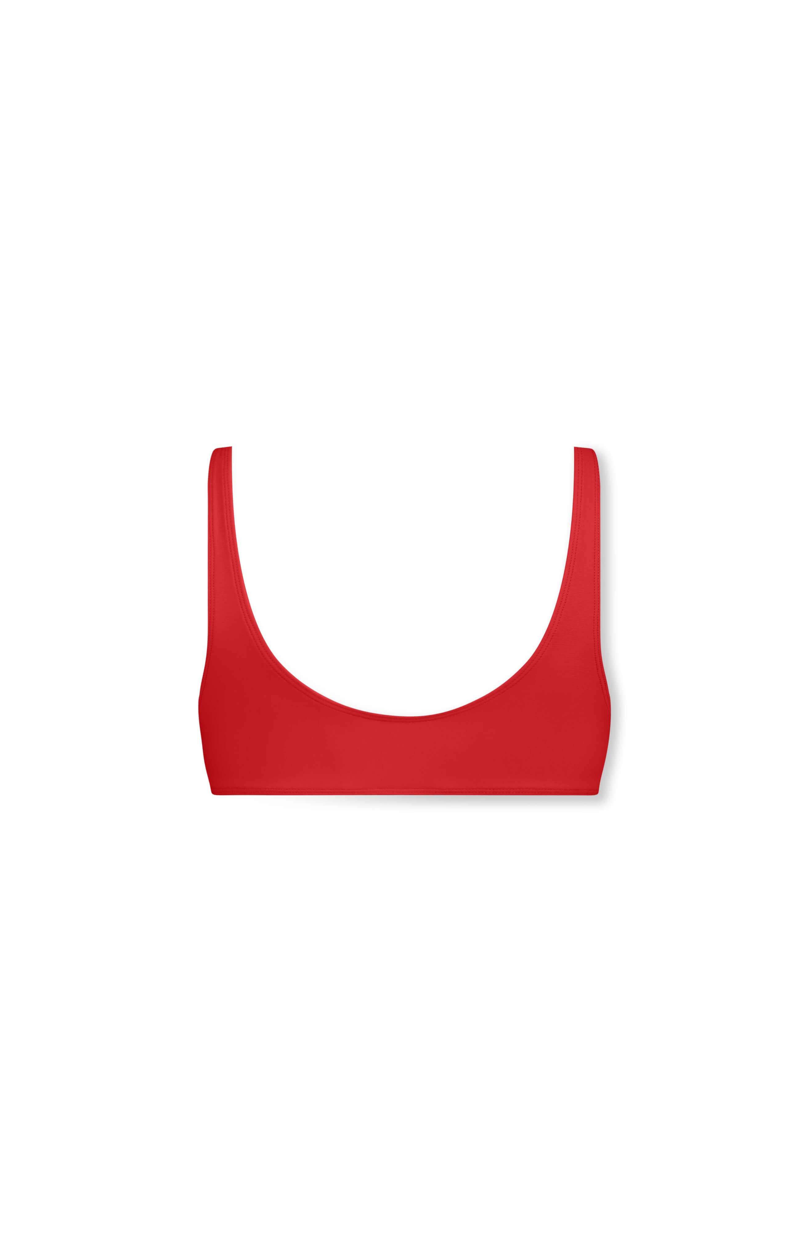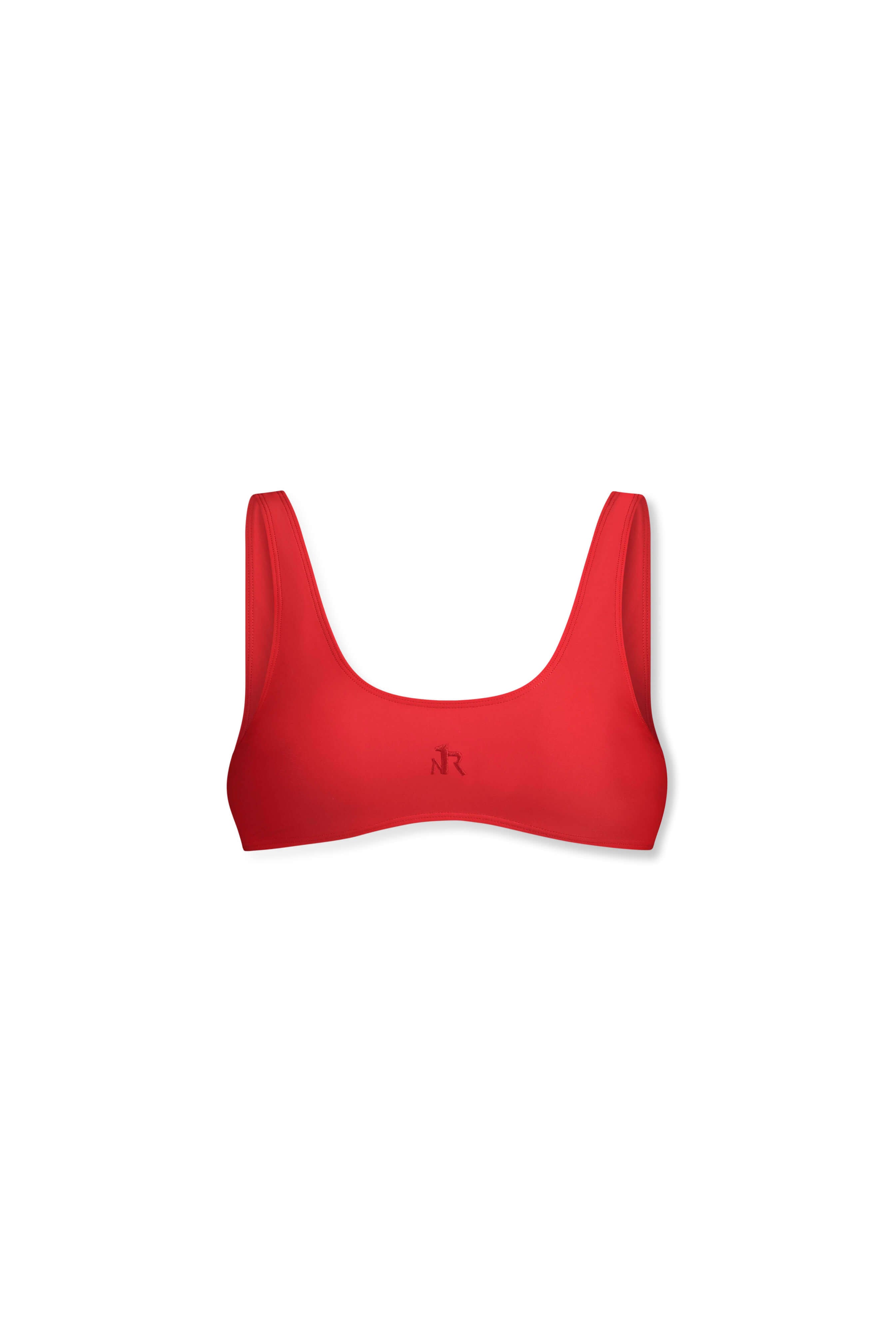 A sporty, tank-style bikini top with wide straps that extend straight from the front into a low, open back. Designed for full shoulder support with a sleek, modern aesthetic.