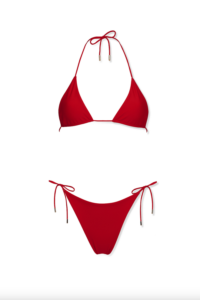 A classic triangle bikini top featuring adjustable ties at the neck and back. The clean, minimalist design includes subtle ruching at the base of the cups for a customizable fit. The soft triangle cut offers a flattering, timeless silhouette that suits all body types.